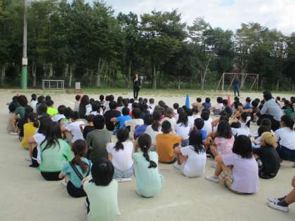 非常ベルが鳴ってすぐに校内放送があり、その指示に従って全校児童が運動場に避難するという訓練です。避難する際の合言葉「お・は・し・も・て」を意識しながら運動場に避難しました。