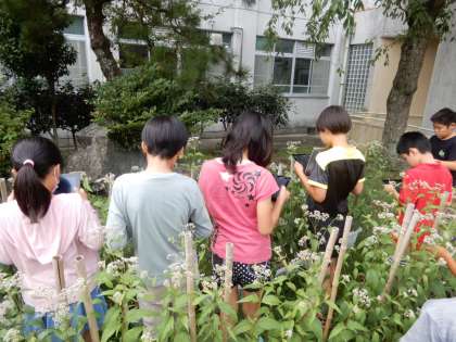 総合的な学習の時間で育てている藤袴の花が咲きました。以前の観察では、つぼみだったので花が咲いている様子を見て子どもたちは喜んでいました。