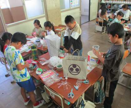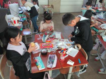 集めた材料をどのように使えば良いかな、どんな色にしようかな…友達と相談しながら創造性豊かな作品が完成しそうです。