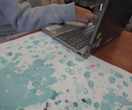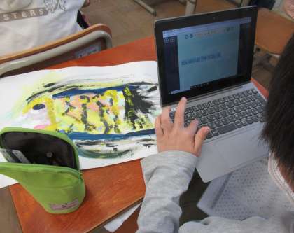 図画工作科「とろとろ絵具でかく」で、友達の作品を見て、