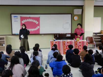 歯科衛生士の方に来ていただき、「虫歯」「歯周病」についての話や、きれいな歯を保つために正しい歯の磨き方を教えてもらいました。歯にまつわる〇×クイズもあり、子どもたちは最後まで集中していました。