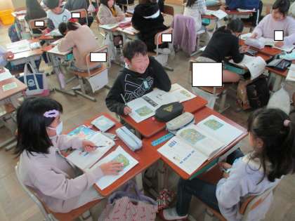 この日は絵から想像したことをグループで交流しました。「主人公は兄弟じゃないかな」「宝箱の中身は〇〇だよ」「こういうルートで冒険すると思うよ」など、どんどん想像が膨らみ、大盛り上がり!