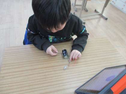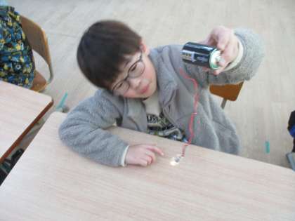 あおぞら3年生の理科では、電気の通り道の学習をしています。子どもたちは、どんなつなぎ方をしたら豆電球が光るのか、いろいろなつなぎ方を予想して、実際に確かめることができました。豆電球が光った時には、「おお。」と歓声があがりました。