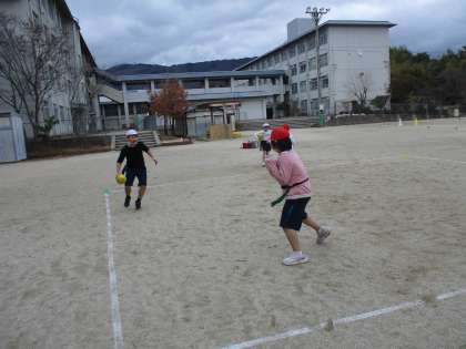 子どもたちはじんとり遊びが大好きです。作戦タイムには、チーム全員で得点を取るために話し合っています。攻撃チームは友だち同士で声を掛け合い、タイミングを合わせて守備の間を走っていきます。「またやりたい。」「次は勝ちたい。」と意欲的に取り組んでいます。