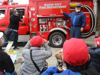 今日は3年生が社会見学で洛西消防出張所へ行きました。あおぞら学級の3年生も「火を消すのにどのくらいかかるのか。」、「どうして銀色の服を着ているのか。」などそれぞれ問いをもって社会見学に臨みました。メモを取ったり、質問をしたりと、消防士さんのお話をじっくり聞いて学習することができました。