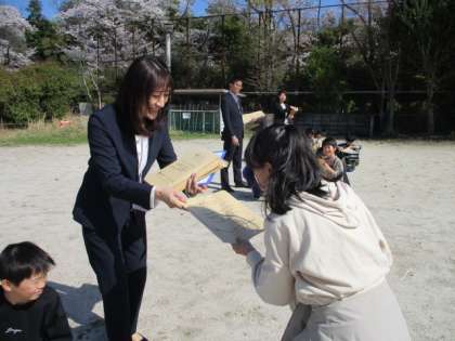 担任の先生から渡してもらう封筒を受け取る子どもたちは、うれしいような照れくさいような表情でした。