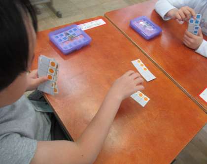 算数科の学習では、数図ブロックや数図カードを使って「〜と〜で8!」と
