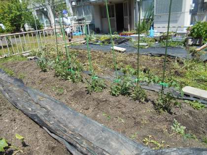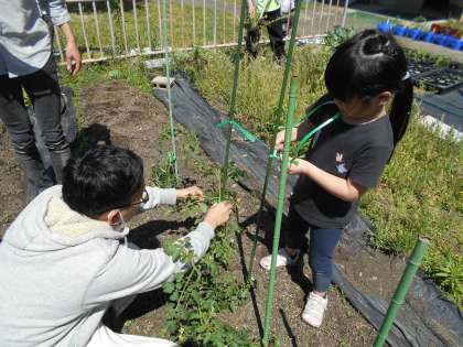 暑い日が増え、野菜はどのくらい大きくなったかな?と楽しみに畑に向かいました。トウモロコシは芽が出て、トマト・ミニトマトはずいぶん大きくなってきています。成長したトマト・ミニトマトには、支柱をたてました。