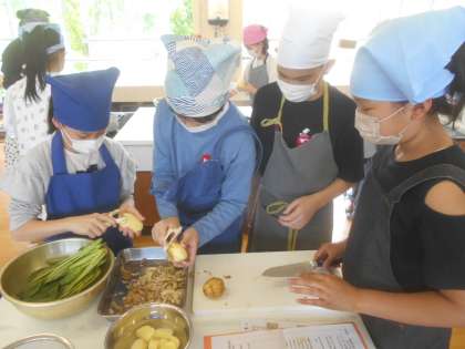 5年生になって初めて調理実習に挑戦しました。グループで協力しながらゆでる調理をしました。事前に学習したことをもとに作り方の手順をしっかりと理解し手際よく進めることができました。「とてもおいしかったので家でも作ってみよう」「ゆで時間が少し短くて固かったので次はもう少しゆで時間を長くしよう」など、自分たちの実習をしっかりとふり返ることができました。