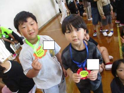 全校で心を込めて作ったメダルを、4年生が代表して1年生に渡しました。