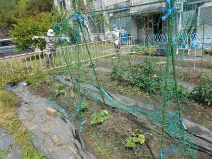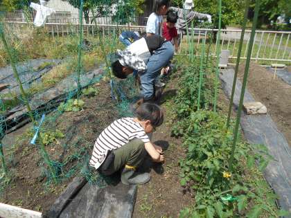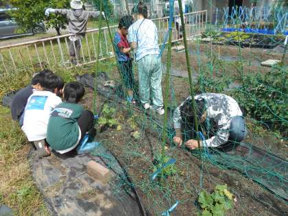 キュウリの花の元にキュウリの赤ちゃんがついていました。みんなで観察して、「可愛いなぁ。」と話しました。みんなで協力して、ネットを張りました。ぐんぐん大きくなって、たくさん収穫できるといいいです。