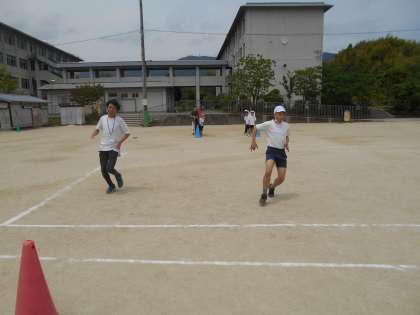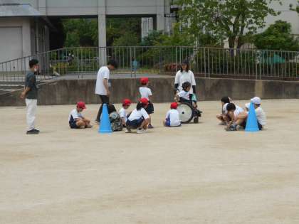 体育科では、準備体操の後、みんなでリレーをしました。赤チームと白チームに分かれ、コーンを回って次の人にタッチ!!同じチームの友だちを応援する声が響きました。いい汗をかきました。