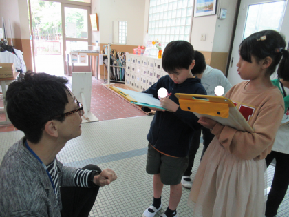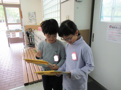 インタビューの練習をしたり、どうすれば分かりやすい看板になるかを考えたりして、1年生との学校探検の準備をしました。