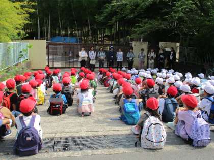 出発前に先生からの注意事項を聞いている様子です。「列を整えて歩きます」「水分をしっかりとります」先生のお話もしっかりと聞くことができていました。