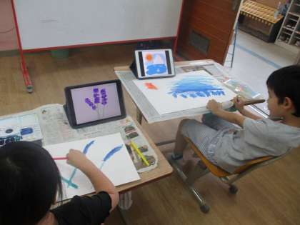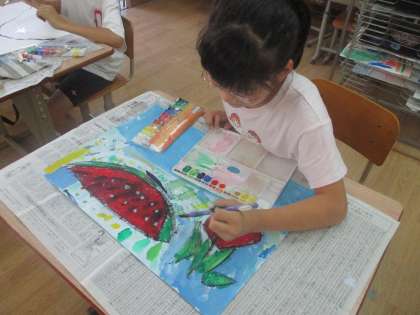 あおぞら学級では、7月のカレンダーを作っています。「海、花火、送り火、スイカわり」など、子どもたちは季節のイメージに合わせて絵をかいています。完成が楽しみです。