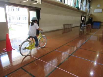 体育館に作られたコースを安全に気を付けて自転車で走行する練習をしました。