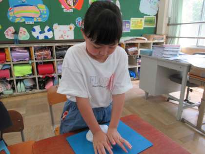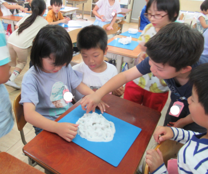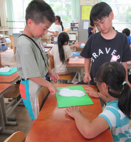 粘土の塊を手全体や指を使って、「握る」「押す」「引き伸ばす」「ねじる」「巻き込む」などのやり方で様々な形にしていました。