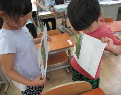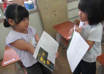 自分で書いたつぼみクイズの紙を友達に見せ、