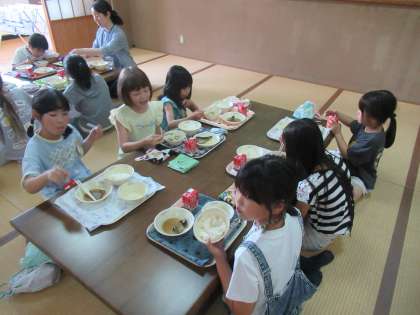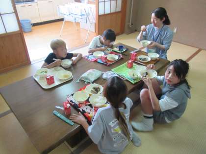にしんなすとかきたま汁を畳のランチルームで食べ、子どもたちも