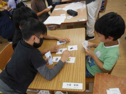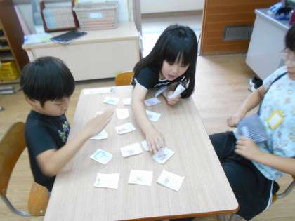 外国語活動では、自分のカルタを作って、アニマルかるたをしています。グループで、読み手と選手に分かれて、仲良しかるたをしました。同時に手を置いたお友だちに譲る場面も見られ、ほほえましい活動になりました。