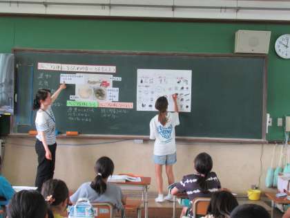 健康な体になるための食べ方を考えました。ある食事の例をもとに健康な体になる食事かどうかを考えました。野菜が足りていないからプラスしようという意見が出てきて、緑のグループの食べ物が含まれているおかずを「食べ物のはたらき」の表をもとに考えました。
