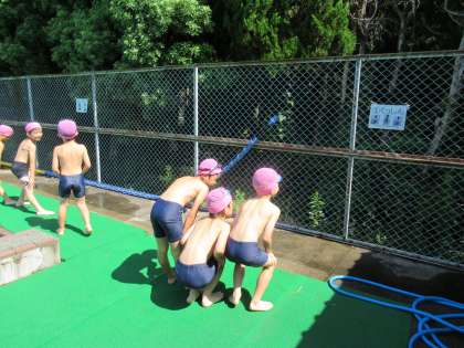 バディとの活動が中心になる体育科『水あそび』。活動時間の見通しをもって進めています。