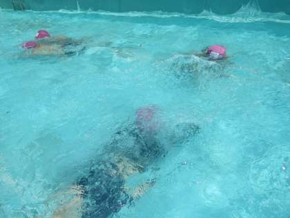 シャワーを浴び、ストレッチをして、水中での水慣れ(歩く、走る、イルカのジャンプ)をします。全てバディとの活動です。
