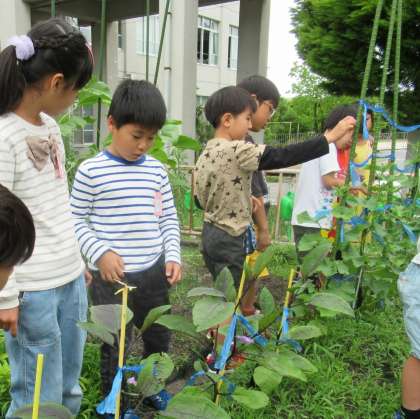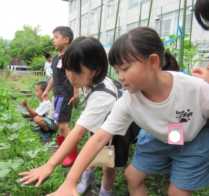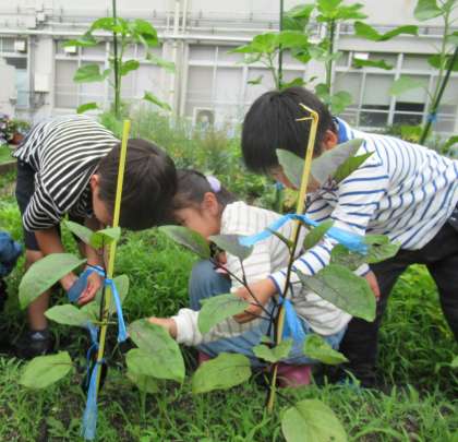 今回は、学校園に植えているナスビ、ピーマン、オクラ、キューリから観察する野菜を選びました。