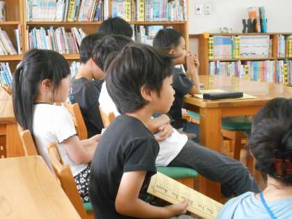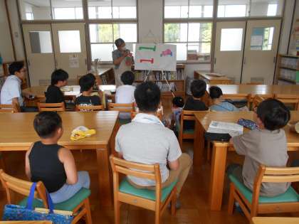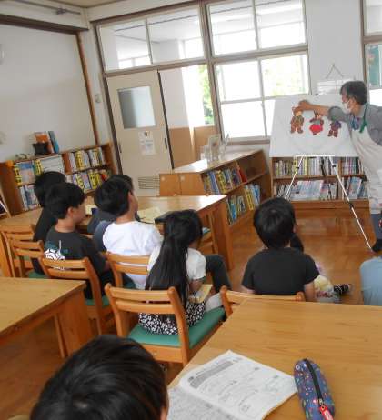 『夏の読書まつり』で、図書館司書の先生が「3びきのくま」のパネルシアターをしてくれました。トルストイの絵本は、くまの名前が書いてあります。長い名前で、難しかったのですが、一生懸命覚えようとしている姿がありました。お話は楽しく、みんな集中して見ていました。