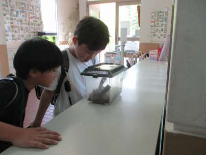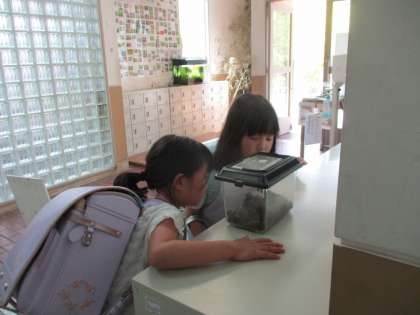 洛西高校のみなさんから、カブトムシが届いたことを本部アソシエーション委員会のみなさんが全校に発信してくれたので、休み時間になるとたくさんの子どもたちが”カブトムシ”を見に来ています。