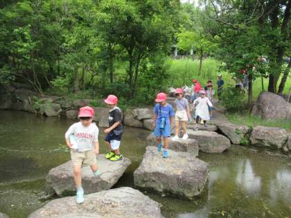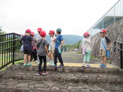 大蛇が池公園では、利用する遊具がある場所のことは知っていたようですが、よく観察すると、二段になった手すりや点字ブロックがあることに気づいていました。また、池に咲く花や昆虫がいることから、たくさんの自然に囲まれていることにも気づいていました。