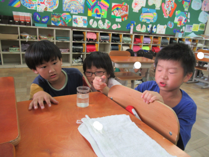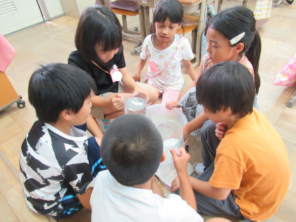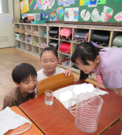 「10mLを10回入れると、1dLになる。1dLになったら、それを10回入れると、1Lになる。」ということは分かっているけど、やってみることで、かさの量を確かめることができたようでした。