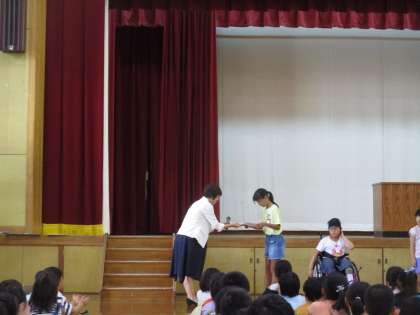 始業式のあと、1学期に取り組んだ硬筆書写と図画工作で顕著な成績を収めた児童への表彰式を行いました。