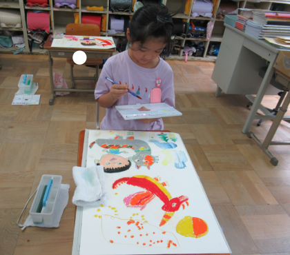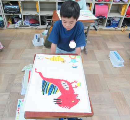 図画工作科『ことばのかたち』では、お話を聞いて想像したことを絵に表しました。登場人物同士が、何かを話している様子を考えるのが、楽しかったようです。