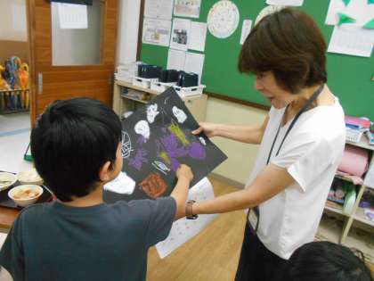 あおぞら学級の1年生は、「カレンダー、今月は校長室に届けたい!」と希望し、校長先生に手渡しをしました。「これは、何の絵ですか?」という質問に対して、「これは、おばけです。」や「これは、黒猫です。と答える子どもたちでした。
