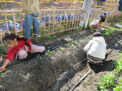 毎日の水やりをしたり、雑草抜きをしたりして、大きくなっているのを楽しそうに見ている子どもたちです。