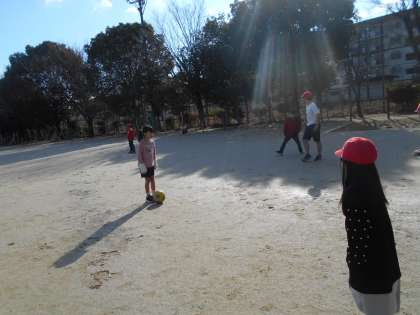 あおぞら体育では、ボールけり遊びを始めました。はじめは寒いと言っていた子どもたちですが、走ったり、ボールを蹴ったりしているうちに体がぽかぽかと温まりました。試合ができるようにパスをつなぐ練習をしています。