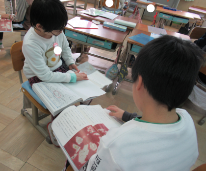 「スーホの白い馬」の教材で、「スーホにとって白馬は、どんな馬か。」「どうして、馬頭琴の音が、聞く人の心をゆりうごかすのか。」などのテーマで、友達と自分の考えを伝え合っています。