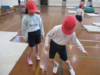 「踏み切り(ドン)・着手(パン)・着地(ピタッ)」を意識して跳んだり、回ったりすることをあそび感覚で繰り返すことで、3年生以上で活動する『とび箱運動』につながっていきます。