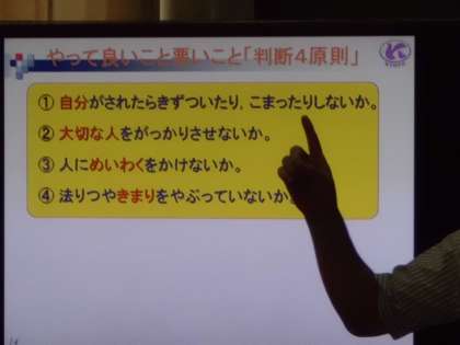講師の方は,西京警察署の生活安全課少年係のスクールサポーターの方々でした。みんな真剣な表情で話を聞いていました。悪いこと,やってはいけないこと,迷惑なこととは具体的にどんなことなのかを教えていただきました。