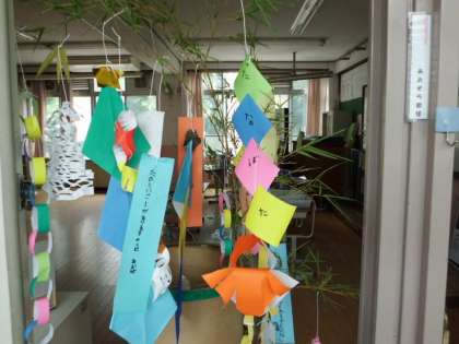 あおぞら学級の七夕飾りが完成しました。2名と担任で作成しました。いろいろな願いを込めた短冊をつるしています。