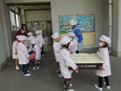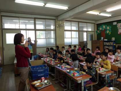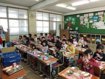 今日から,給食が始まりました。1年生は,お当番も初めてです。パンやおかずの入れ物を運んだり配膳したり,給食調理員さんや栄養教諭の安村先生,支援員さんなどたくさんの方に見守られて頑張りました。今日の献立は,「小型コッペパン,牛乳,スパゲティのミートソース煮,ほうれん草のソテー,りんごゼリー」です。食べ始めたら,‘おいしい,おいしい’と,みんな笑顔いっぱいでした。