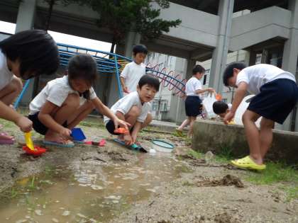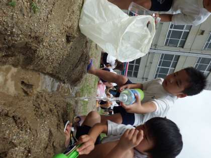 スコップやペットボトルを使ってお友達と協力しながら大きな川を作ったり,またそこから橋を作ったり,トンネルを作ったり。。