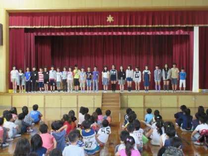 学級の代表が舞台の上に立ち,全校の前で大きな声で発表しました。