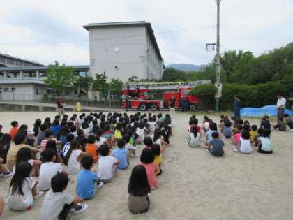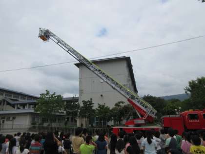 今回は,西京消防署の方にも来ていただき,避難の様子を見ていただいたり,はしご車の活動の様子を見せていただいたりしました。
