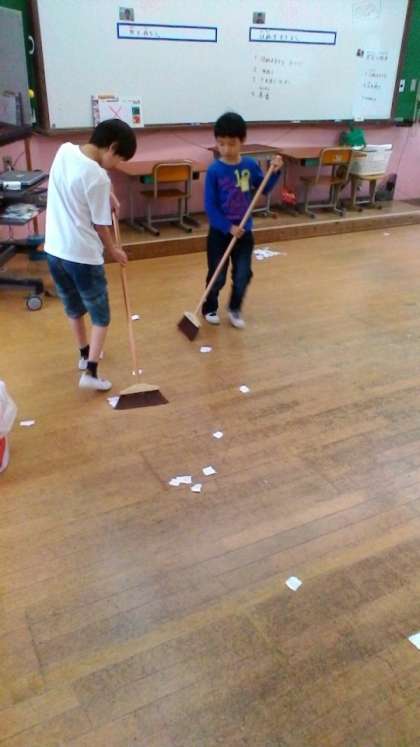あおぞらクラスでの掃除は,まず先生が教室に紙をまくことから始まります。