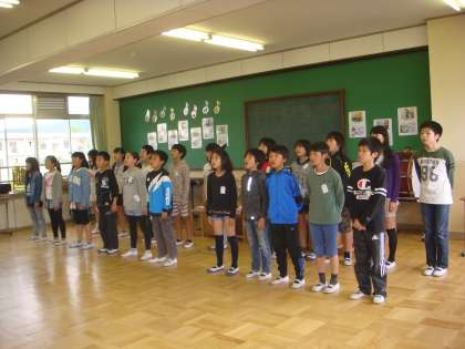 5月17日(水)午後,校長室で仕事をしていますと,素敵な歌声が聴こえてきます。さっそく見に行くと,6年生が明日の1年生を迎える会の練習をしています。