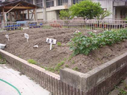 子どもたちが種をまき,植物の生長を観察するためには畑づくりをしておかなければなりません。竹の里小学校の畑は,畝ができ,学年のプレートが立てられています。植物がよく育ちそうなとってもいい色をした土です。6年生の畝には,もうすでに,しゃがいもの苗が育っています。