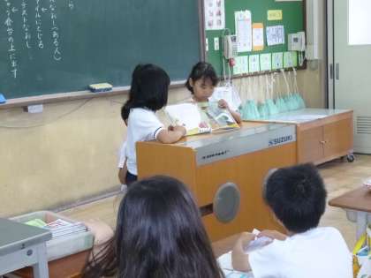 朝のステップの時間に本がかりが読み聞かせをしてくれました。今日の本の題名は『ともだちや』です。本ががりだけでなく,いろいろな係が自分たちのアイデアでがんばって活動しています。