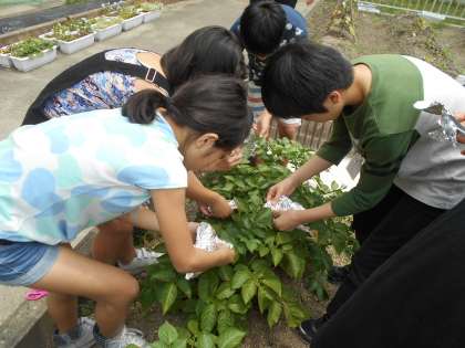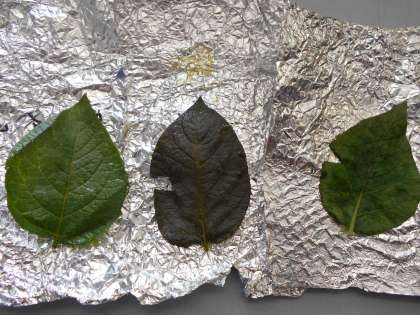 前日に日光があたらないようにジャガイモの葉をアルミホイルでおおいました。
